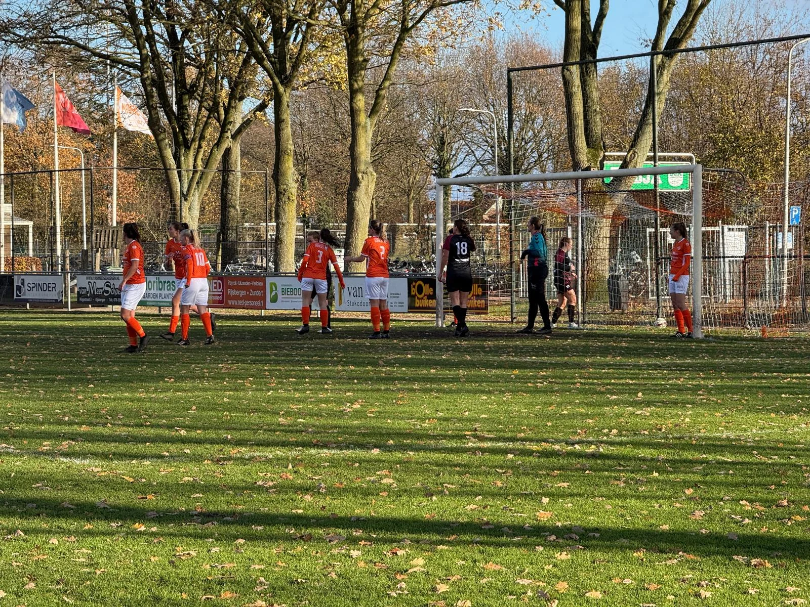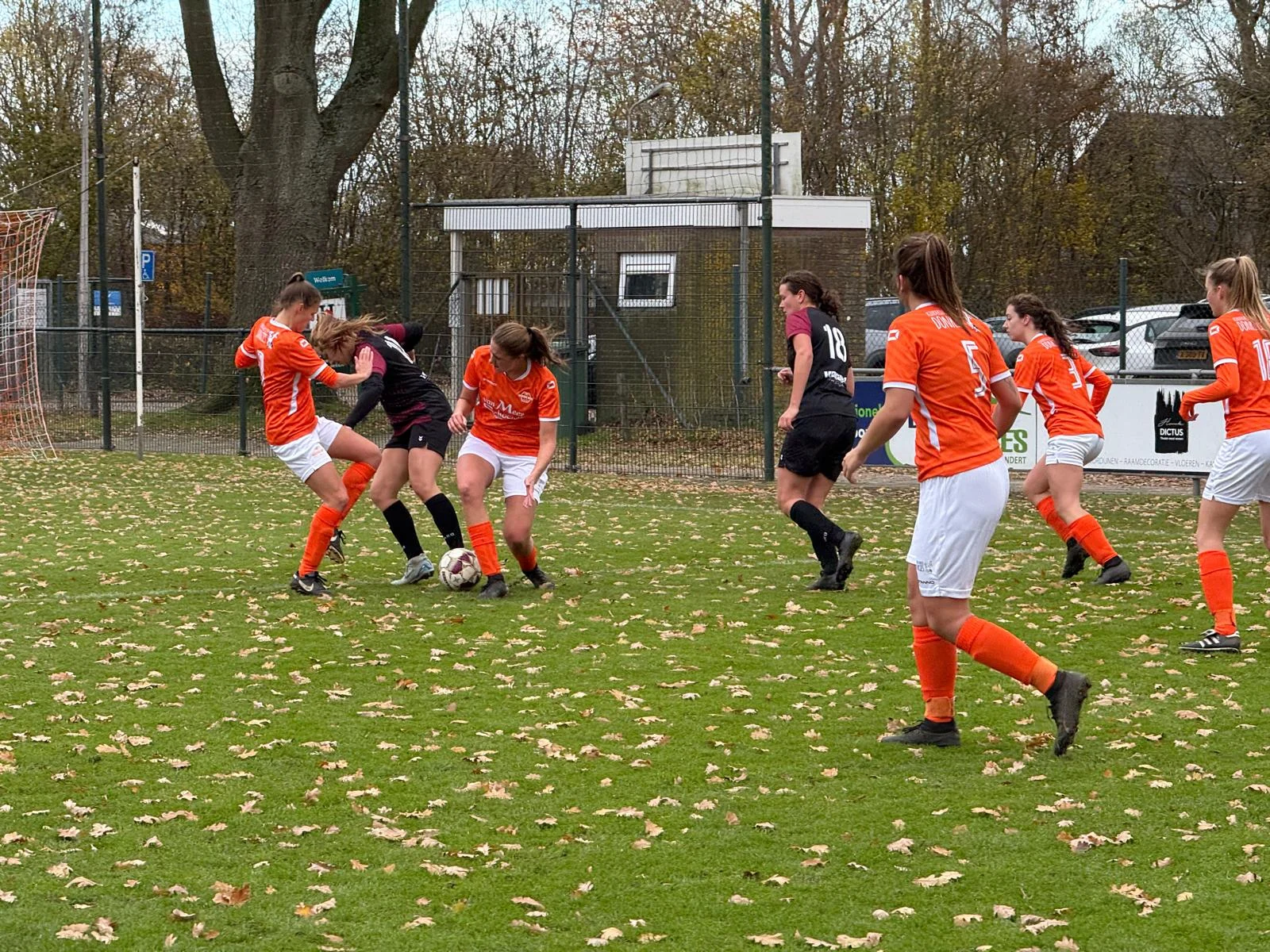 Gaandeweg de eerste helft probeert de Moer zich voetballend wat meer te laten gelden. Zowel linksback Iefke als rechtsback Jess steken enkele keren de middellijn over om zich ook aanvallend te melden. Spitsen Minke de Bruijn en Joy worden ondanks hun harde werk én de vele vuile meters die zij maken, niet in stelling gebracht. In de eerste helft weet de Moer uiteindelijk twee maal het vijandelijk doel onder vuur te nemen. De eerste poging komt op naam van Chloé en vlak voor rust beproeft ook Robin haar geluk. Echt gevaarlijk wordt het echter niet.
