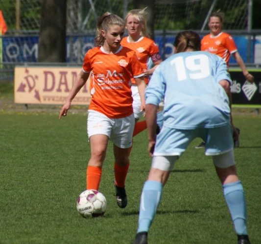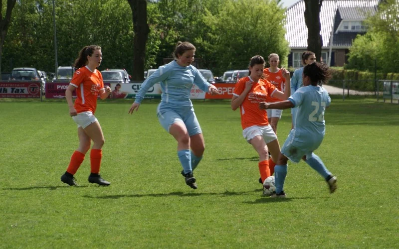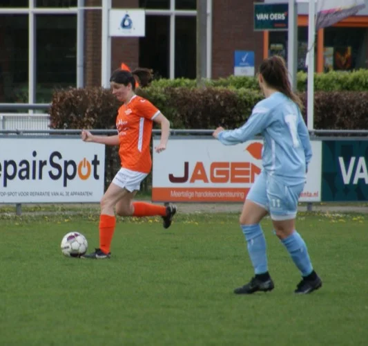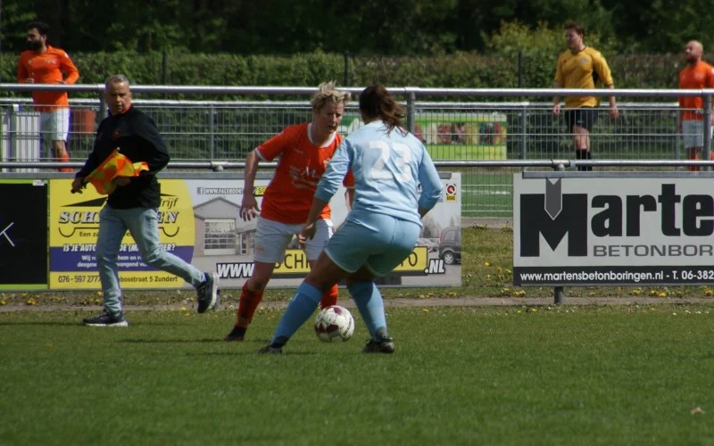 De laatste twintig minuten werken beide teams hard, maar er gebeurt weinig spannends meer. Enkele snelle uitvallen worden door de Klein-Zundertse defensie prima verdedigd. Met Anna en Jess in het veld, die de moegestreden Dorris en Robin vervangen, voetballen de oranjehemden zich naar de eerste thuiszege in de competitie. En hoewel het uiteindelijk bij 3-1 blijft, valt de mooiste goal van de middag nog wel. Joy draait zich vrij en zet haar schoen vol onder de bal, die in de verre kruising vliegt. Een prachtige bal, maar helaas ging er wel een duwtje aan vooraf dat de scheidsrechter net iets te stevig vond… Kort daarna krijgt ook Bregje nog een kans(je), maar haar inzet wordt een prooi voor de keepster.