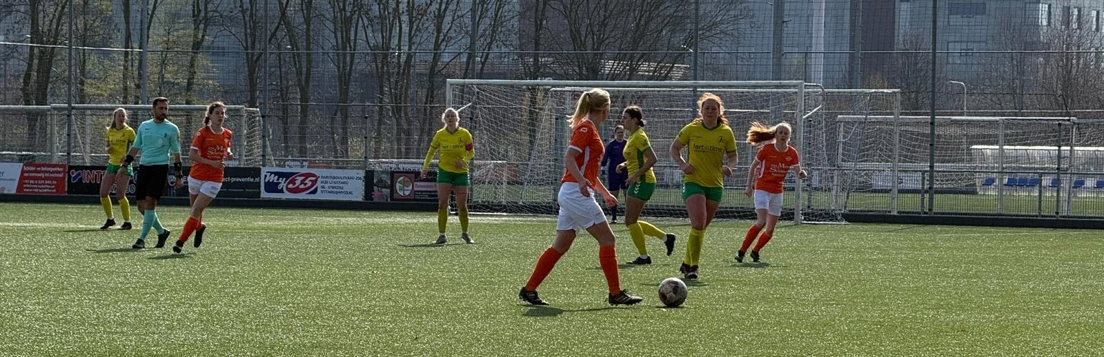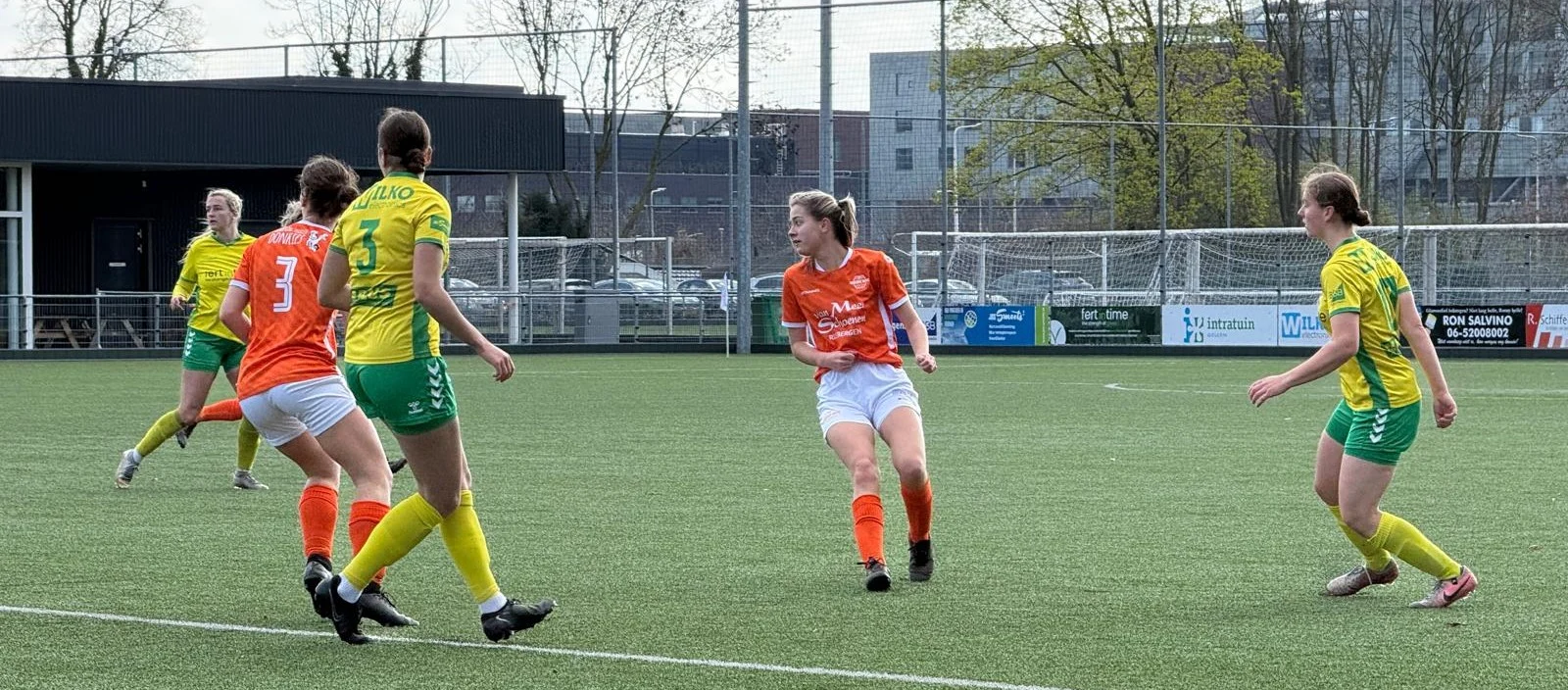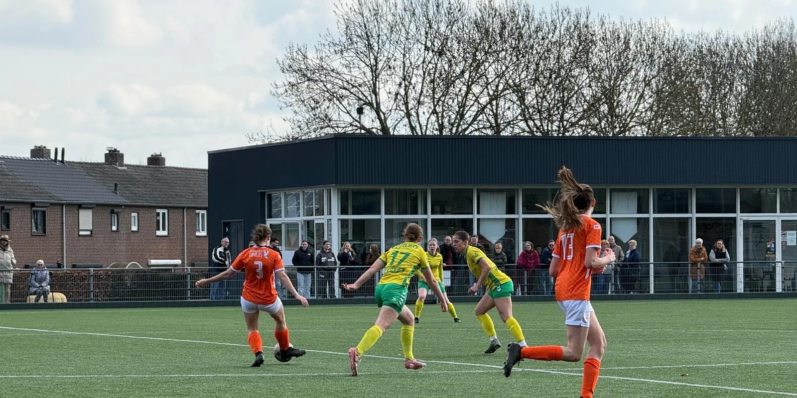 Het veldoverwicht van de bezoekers levert enkele mogelijkheden op, maar het doel wordt nog niet gevonden bij pogingen van Minke de Bruijn, Lotte en Sigi. Dan, in de 77e minuut, volgt de beloning. Minke Snepvangers levert een perfecte inworp. Lotte ziet de ruimte, bereikt de achterlijn en trekt de bal terug. Minke de Bruijn is meegelopen en schiet hard en zuiver in de onderhoek: 0-1! Een prima doelpunt; nu is het zaak om de voorsprong over de streep te trekken.