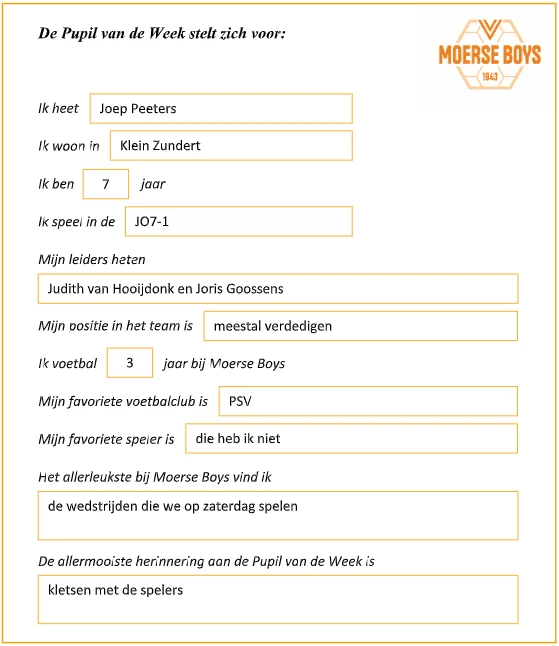 Tijdens de wedstrijd van Moerse Boys 1 tegen Victoria ’03 op zondag 12 april was Joep Peeters van onze JO7-1 pupil van de week. Joep gaf voor de wedstrijd het goede voorbeeld aan de spelers van Moerse Boys 1 door vanaf de aftrap direct te scoren. Vervolgens nam Joep gezellig plaats op de reservebank waar hij samen met de reservespelers de wedstrijd analyseerde. Dit hielp dusdanig goed dat Moerse Boys 1 de wedstijd met een 3-2 overwinning wist af te sluiten. Een mooie middag voor Joep waar hij hopelijk met veel plezier aan zal terugdenken!